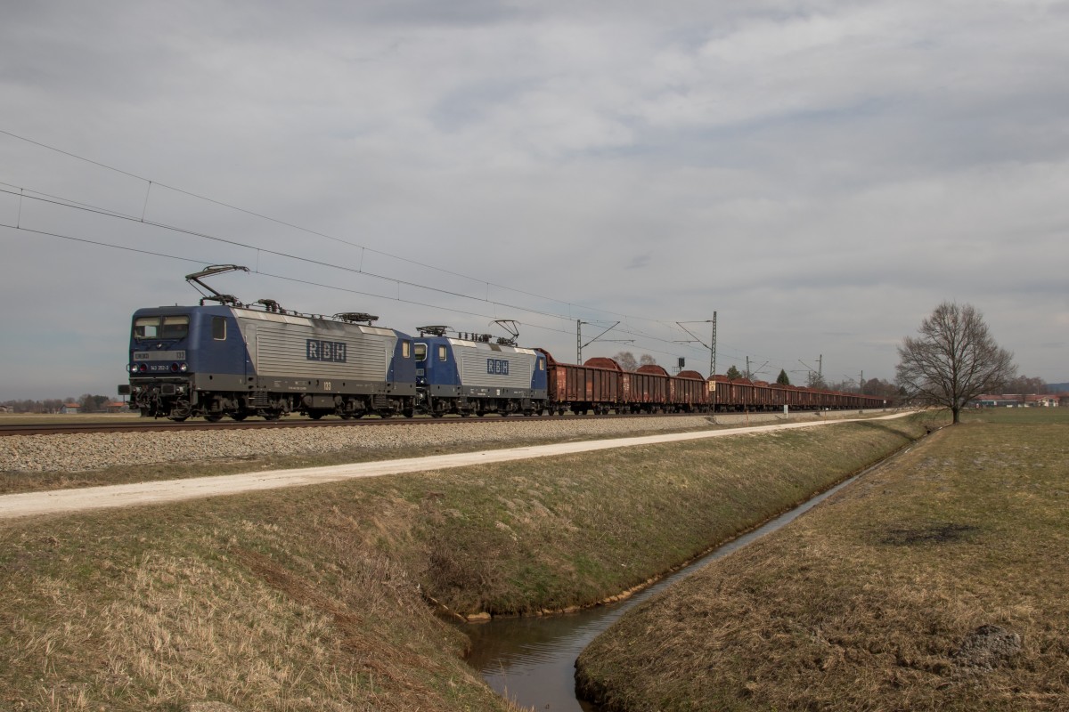143 352 und 143 305 kamen mit einem leeren Holzzug aus Freilassing. Aufgenommen am 16. März 2015 bei Weisham.