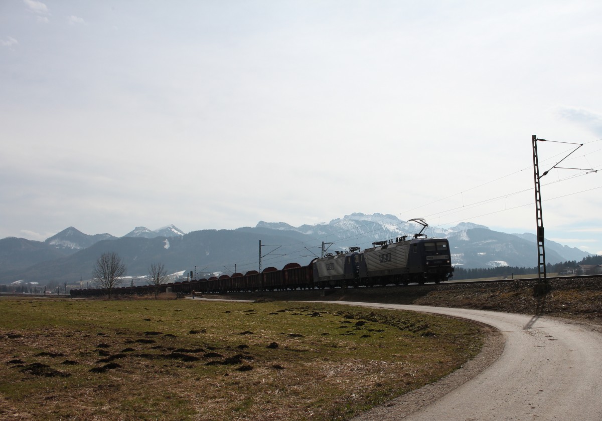 143 133 und 143 131 mit einem Ganzzug aus Salzburg kommend am 6. März 2015 bei Übersee am Chiemsee.