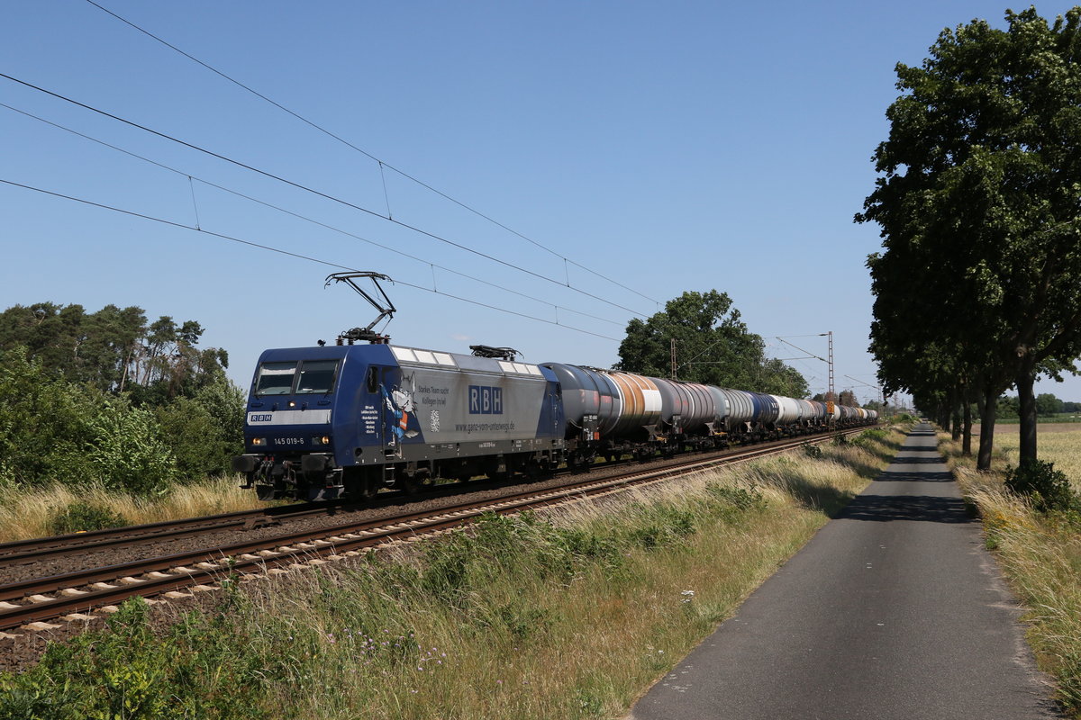 145 019 mit einem Kesselwagenzug am 27. Juni 2020 bei Dörverden.