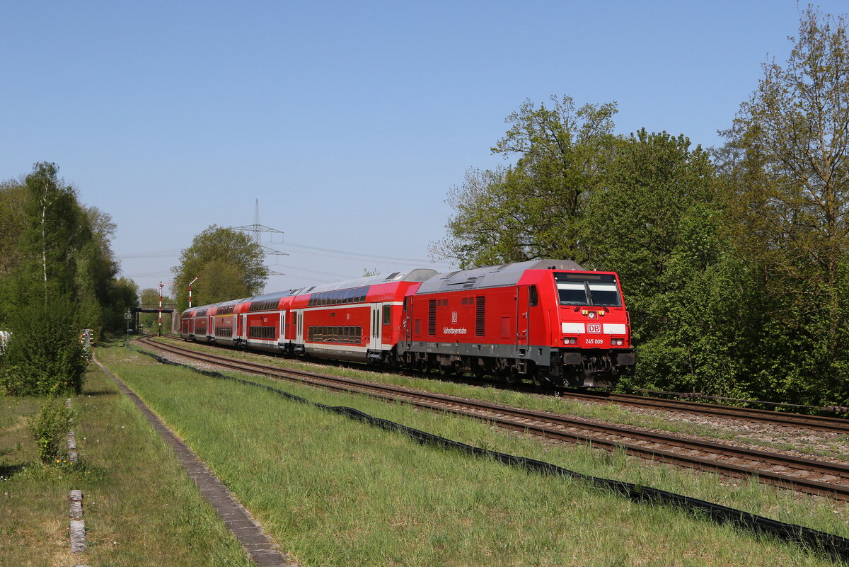 245 014 schiebend an einer "RB 40" in Richtung München. Aufgenommen am 29. April 2025 in Thann/Matzbach.