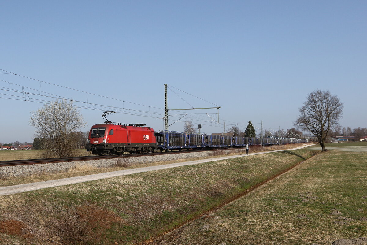 1116 101 mit einem Autozug aus Salzburg kommend am 7. März 2026 bei Übersee am Chiemsee.