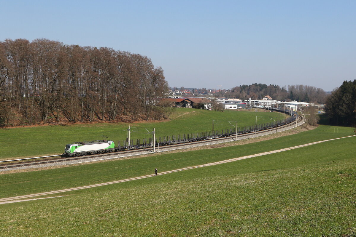 193 831 "Christian Doppler" mit einem leeren Holzzug aus Freilassing kommend am 4. Oktober 2020 bei Übersee im Chiemgau.